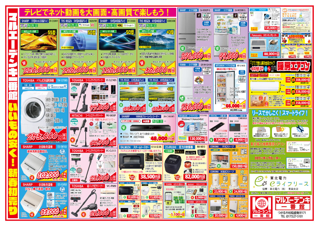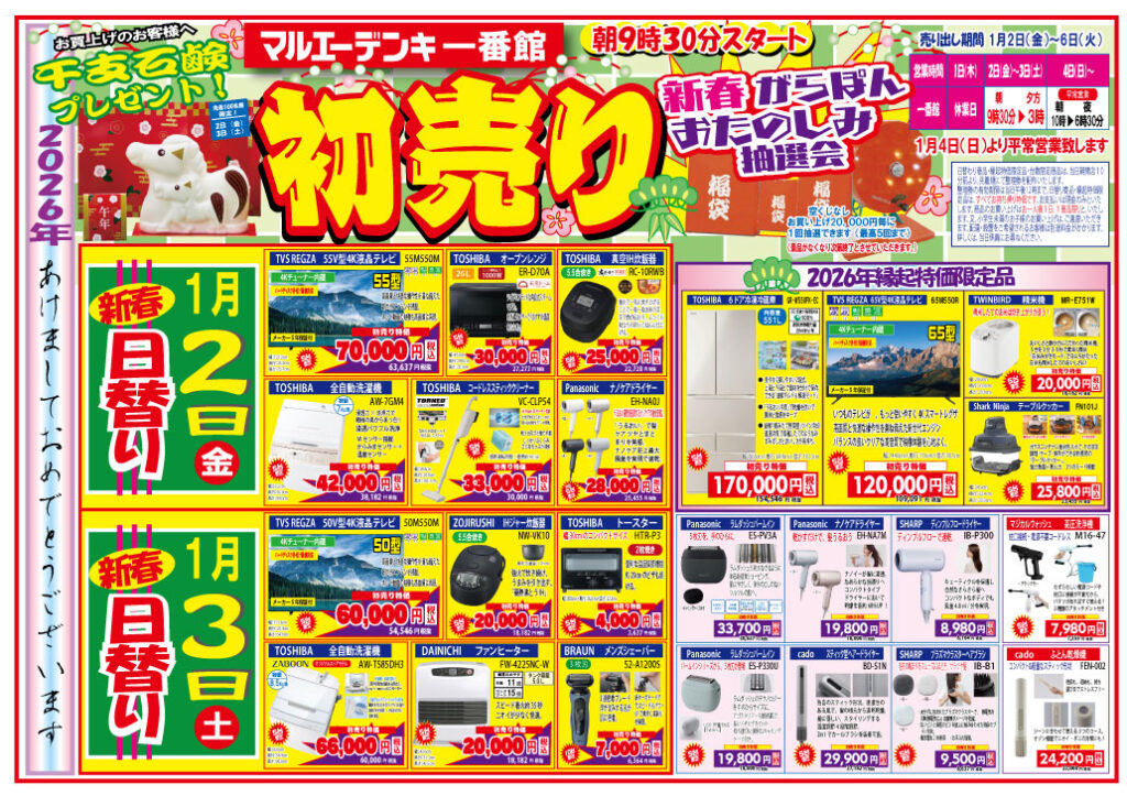 2026年1月2日 / 最終更新日 : 2026年1月2日 長谷川 康則 マルエーデンキ一番館 新春初売り 西北五地区版 あけましておめでとうございます。本年もマルエーデンキ一番館を何卒よろしくお願い申し上げます。 問い合わせは、下記まで ☎ 0173-27-5101 1月2日・3日は15時までの営業となっております。4日より通常営業となりますのでお間違えの無いようにお願い申し上げます。 FacebookXBlueskyCopy