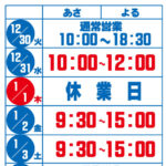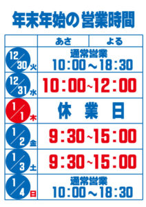 2025年12月19日 / 最終更新日 : 2025年12月19日 長谷川 康則 マルエーデンキ一番館 1月定休日のお知らせ 一番館は、1月1日(木)・7日(水)が定休日となっております。 FacebookXBlueskyCopy